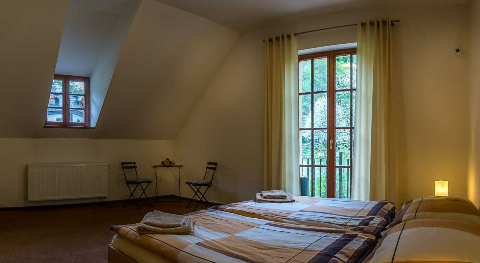 Vstúpte do našich útulných dvojizbových apartmánov naposchodí. Každý apartmán poskytuje priestrannú spálňu s veľkou manželskouposteľou a možnosťou doplnenia o detskú postieľku. V apartmánochje možná prístelka na veľkej rozťahovacej dvoj pohovke umiestnenejv obývacej časti. V obývacia časti jeumiestnená aj TV s plochou obrazovkou. Kuchynská časť pozostávas kuchynskej linky so zabudovanou chladničkou vrátane mrazničky, keramickouvarnou doskou, mikrovlnnou rúrou, elektrickou kanvicou, kávovarom na prekvapkávanúkávu, jedálenským posedením. Detská postieľka a detská stolička na vyžiadanie.